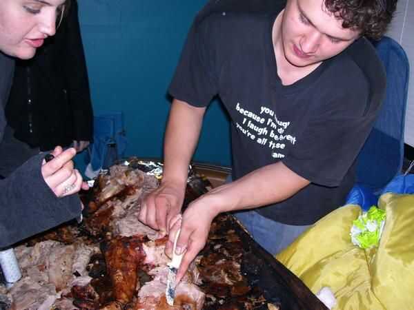 Ahora para la alegría verdadera de este viaje, comer! Primero utilice cortadores de alambre para abrir el cerdo y quitar el espetón. En las fotos, que fue colocado en algún papel, cortado y comido. Si sabes cómo cortar la carne, luego cortan correctamente. Si quieres sacar las costillas después de cocinar, deberás romper antes de escupir la bestia, con una hacha o martillo y un cuchillo grande. Sin lados con el cerdo en la foto, y nadie quería para cualquiera, el cerdo era una estrella solo. Presentar el cerdo quieras, la tradición es hacer una cama gigante de lechuga, colocar el cerdo en la parte superior y pegar una manzana en la boca. YUM! Restos con este tipo de cocción pueden ser dudosos, carne cocida se puede almacenar como cualquier otro, pero, la parte más profunda, aunque alcanzan temperatura, todavía de aspecto rosado; Utilice su mejor juicio. La piel, si crujiente, también es buena para comer; así como la mayoría de todas las demás partes, snoot, hocico, cola de orejas. En su mayoría todos sabe como carne de cerdo. ¡ Disfrute!