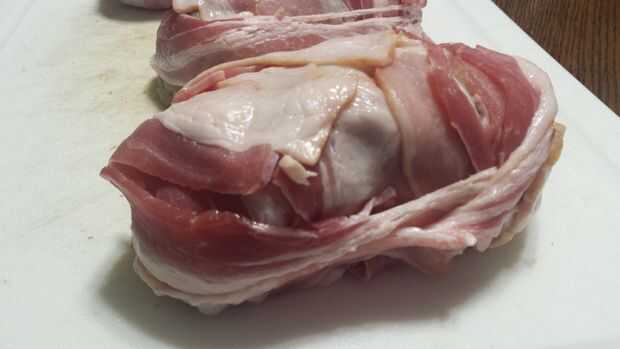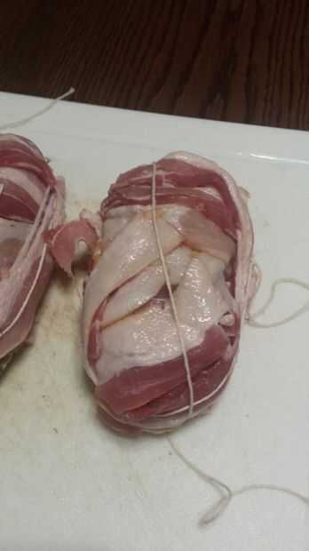 Envuelva los panes en tocino. Envolverlos para que no se puede ver las patatas y atar con cordeles. La guita te mantendrá el tocino en el pan cuando les ponga en el horno. Ahora ponerlos en el horno durante 25 minutos a 375 grados. Después de 15 minutos usted deberá girar los panes encima para que la grasa del tocino no freír la parte inferior de la masa. Quiere que cocinen de manera uniforme.