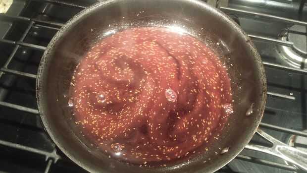 En una cacerola cocinar el vino tinto, mantequilla, salsa de soja hasta que la salsa espese. Condimentar a gusto.