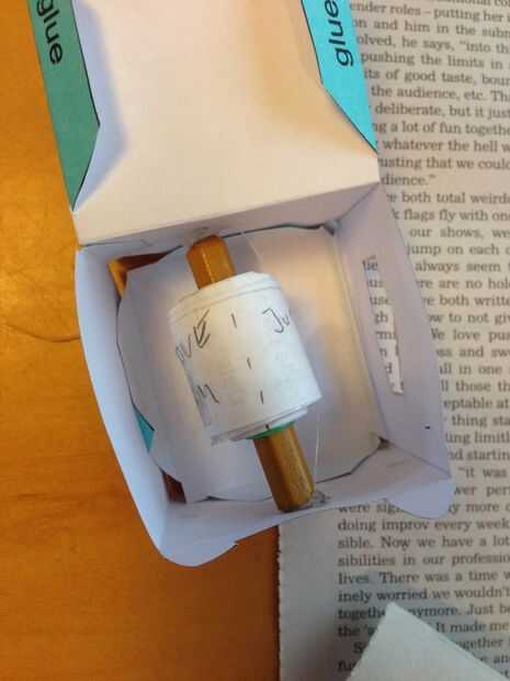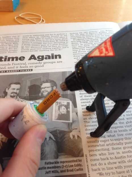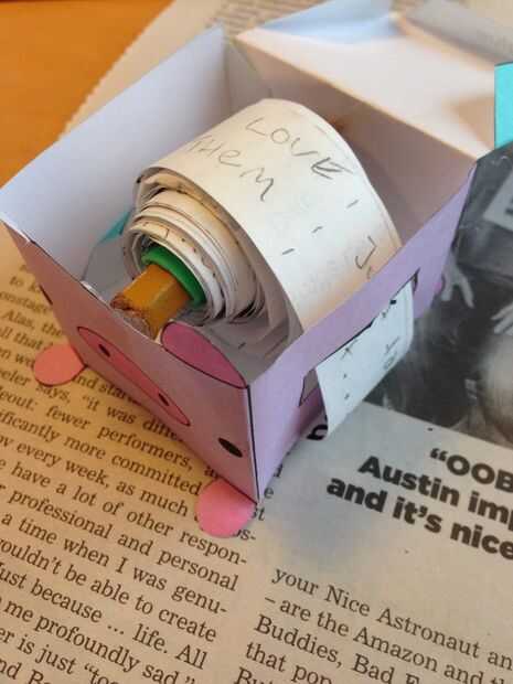 Caliente pegar el lápiz en el cerdo con el rollo de la inspiración en él. Uno de los extremos se debe pegar en el interior de la cara y el otro en el interior de la culata. Antes de montar la tapa tome la cinta de su roll de inspiración y asegúrese de que algunos del rollo está pegando fuera de la ranura en el lado del cerdo. Ahora cierre la parte superior del cerdo, y si desea puede hacer una cola de izquierda sobre papel. Cuando usted está en necesidad de inspiración, simplemente saque su cerdo increíble de inspiración!