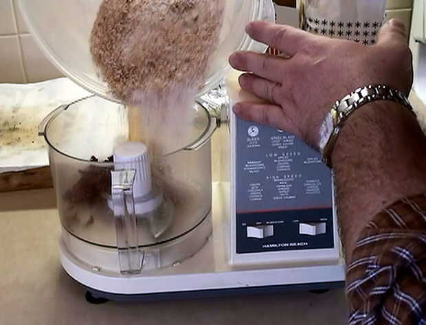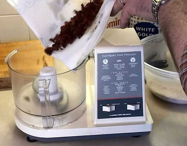 7. Si no tienes acceso a un procesador de alimentos puede cortar el tocino a su tamaño final con un cuchillo.  Coloque los trozos de tocino cocido en una tabla para picar y cortar con cuchillo de chef para el tamaño de medio grano de arroz blanco, o aproximadamente el tamaño de un caramelo "Nerd".  Mezclar con los ingredientes secos en un tazón grande utilizando un tenedor o un batidor.