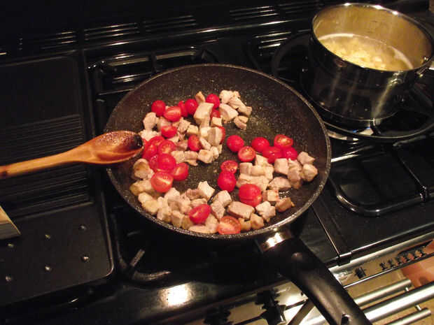 Cerdo picante y tomates con Pasta cremosa (2 / 6 paso)