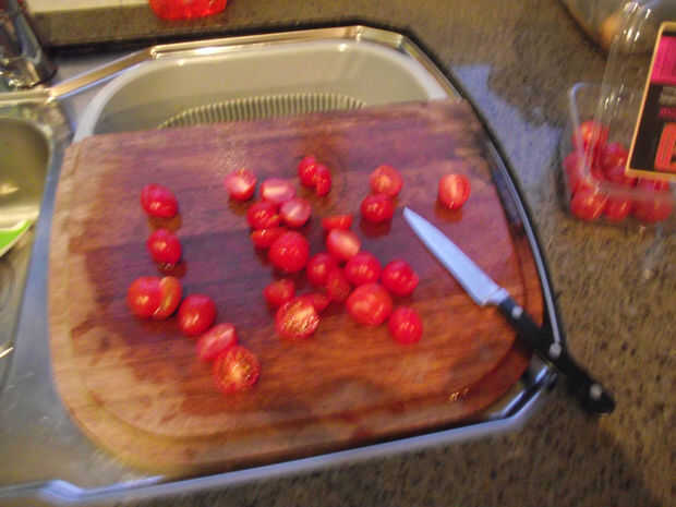 I cortar aprox. 200 g de tomates cherry por la mitad y agrega