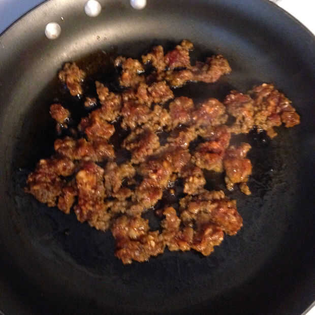 5. Añadir chorizo pan y romper chorizo con cuchara de madera en una sartén sobre fuego medio alto hasta que esté listo