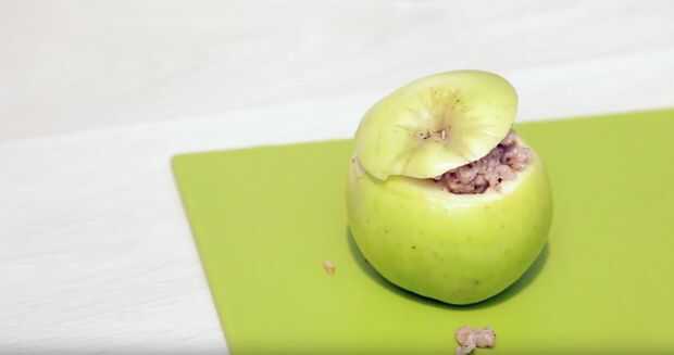 Añadir un huevo batido a la mezcla de carne de cerdo y rellene las manzanas, sustitución de la parte superior de las manzanas para hacer una 'tapa'.