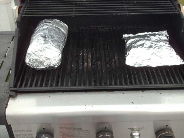 3. después de dos horas, el paquete de la hoja de transferencia a una placa (no un plato para servir aún no lo ha hecho!) y deje que se enfríe durante unos minutos. Cuando está suficientemente frío al tacto Retire la lámina y coloque la carne hacia abajo en la parrilla y continuar la cocción. Ahora sería un buen momento para agregar las astillas de madera más para desarrollar sabor más ahumado pero eso depende de usted.