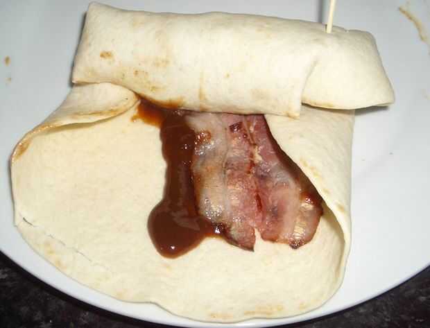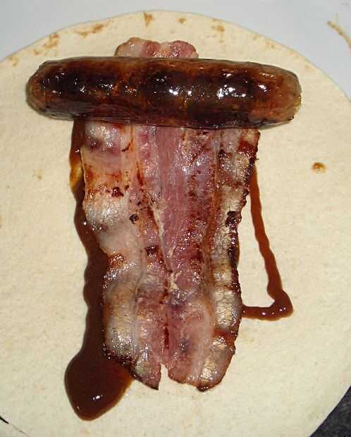 En un tubo que contiene la salchicha en el centro del rodillo cuidadosamente la tortilla y bacon. Si el cerdo no quiere permanecer en su manta luego asegure con un palillo.