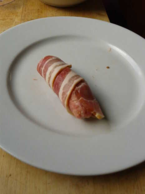 Siguiente: horno! Debo confesar un poco antiguo de mi horno. Todos los números y los símbolos han frotado mucho tiempo off de los diales, así que no tengo ni idea lo que fue establecido en. Probablemente unos 175C por convección. Dejarlos allí hasta que el tocino se agradable y crujiente. Véase: primera página de esa bella imagen de cómo salen.