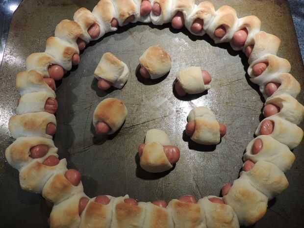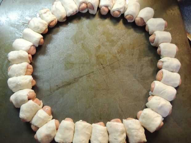 Rocíe una bandeja para hornear galletas con spray de cocina. Arreglar los perros calientes en un gran círculo con un diámetro interior de 9 in. Si tienes cerdos extras, los hornee en el centro del anillo. Hornear el anillo en un horno precalentado 400˚F para 10-13 minutos hasta que doren ligeramente.