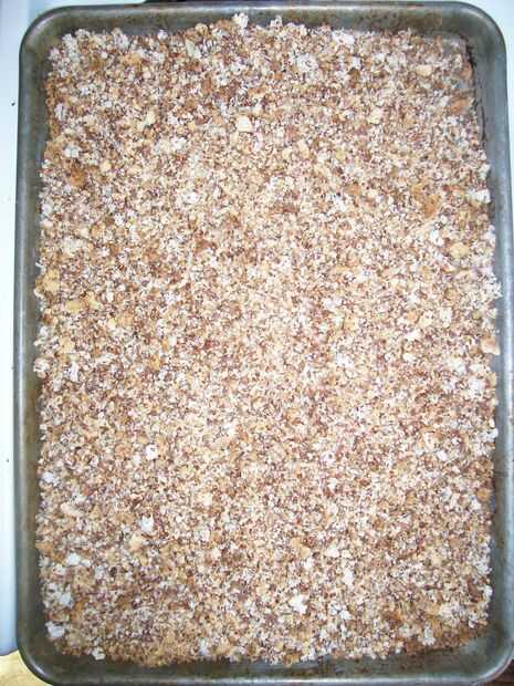 La harina de almendra que queda de hacer leche de almendras, en una bandeja de medio de propagación. Coloque en el horno y dejar para hornear a 300 grados F por aproximadamente una hora, revolviendo una vez o dos veces para determinar el grado de sequedad. Puede tomar antes o dejarla en más tiempo, dependiendo de su preferencia para palidez o aspecto dorado sin embargo. Todo lo que importa es que sea completamente seco, para el almacenamiento. Esto fue dejado en una hora.