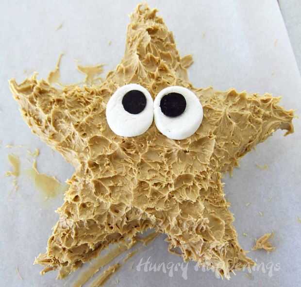 Cortar un malvavisco en tres rodajas. Comer la rebanada de centro o descartar. Presione el lado pegajoso de las otras rebanadas de dos melcocha en la mantequilla de maní fudge estrellas de mar. Pulse uno Hershey Kiss en cada malvavisco crear ojos.