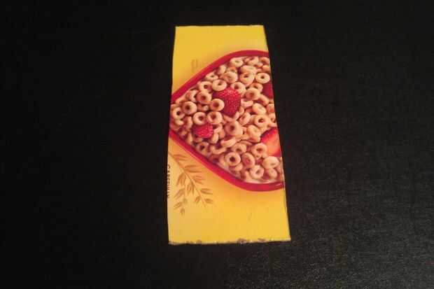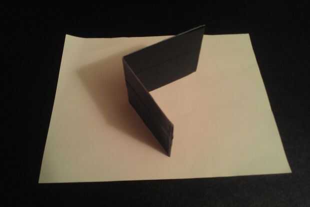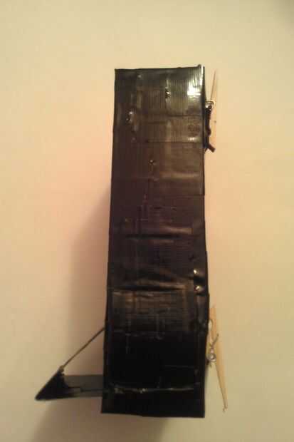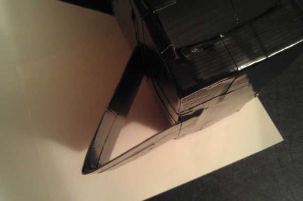 Tomar la otra mitad de la pieza de la cubierta frontal y cubierta de cinta adhesiva. A continuación, doblar el ángulo aproximado de muestra (un poco más de la mitad). Entonces, cinta adhesiva en el centro inferior de la espalda de la caja. Prueba para asegurarse de que el cuadro está parado para arriba.