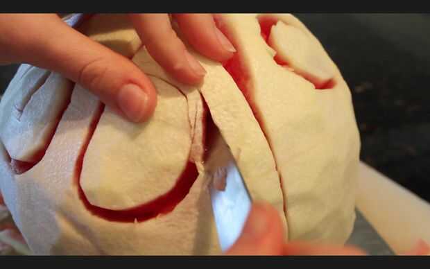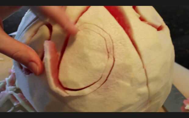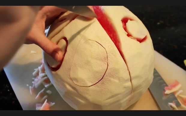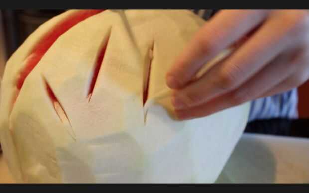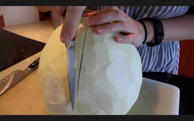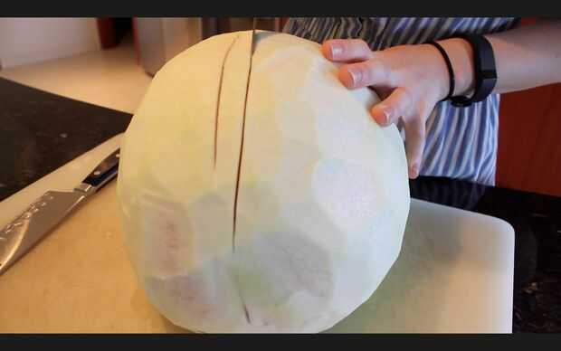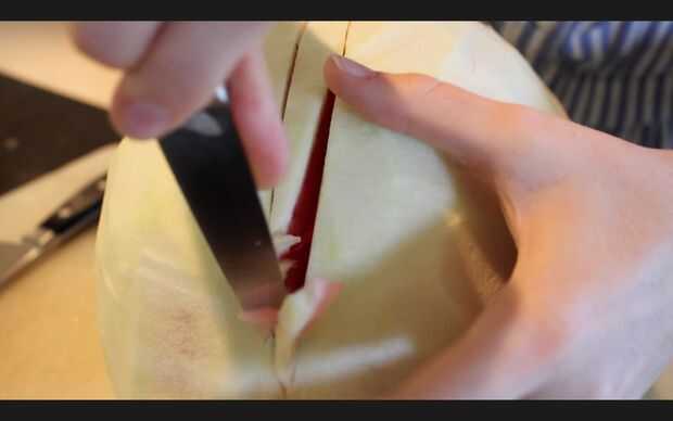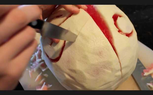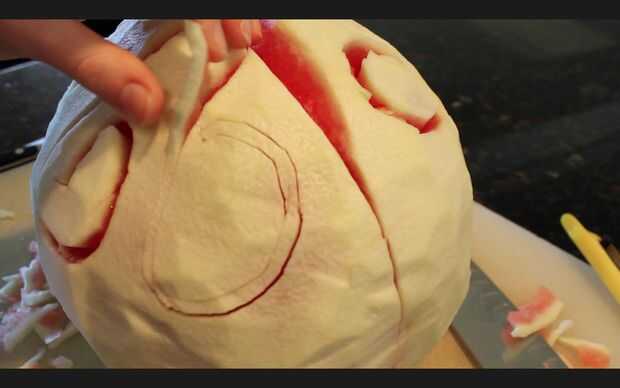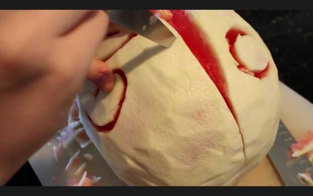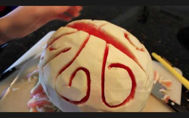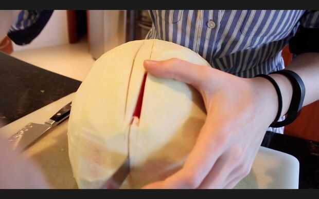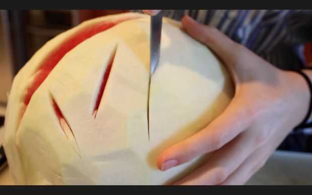 Una vez que todo el verde se ha quitado de la sandía (Frank), con su pequeño cuchillo corta ranuras poco profundas en el cerebro. Hacer el primer corte hacia abajo en el centro de la sandía para separar las mitades del cerebro.