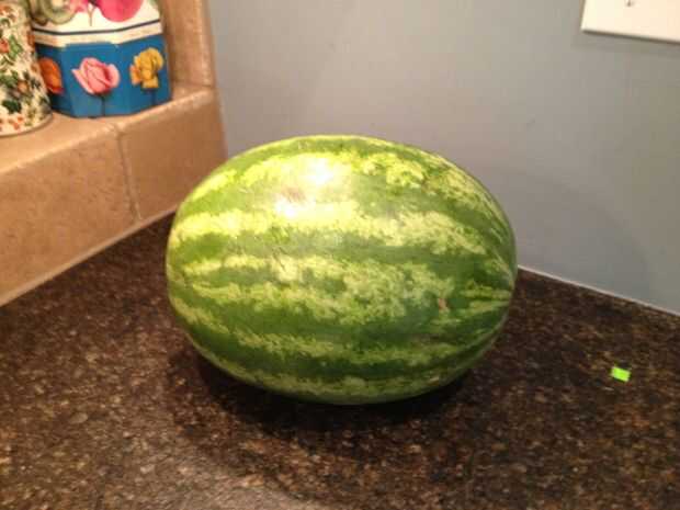 Para todos los materiales que necesitas es un cuchillo de cocina de regular, un pelador de verduras, una tabla de cortar y una sandía que es ligeramente más larga que es ancha, Sabe usted de cerebro en forma. Este es el melón de agua que utiliza.