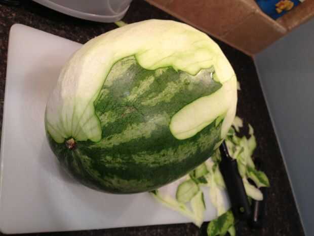 Pelar el melón pelarlo como pelar cualquier otra fruta. apenas más grande. Usted debe pelar de toda la piel verde y un poco de la corteza blanca hasta un poquito de lectura puede verse a través del blanco. Esto le dará a tu cerebro un color bonito cerebro rosado. Peeling lleva mucho tiempo pero no necesita ser perfecto. La idea es solo git deshacerse de la piel verde.