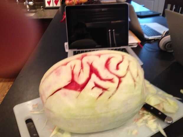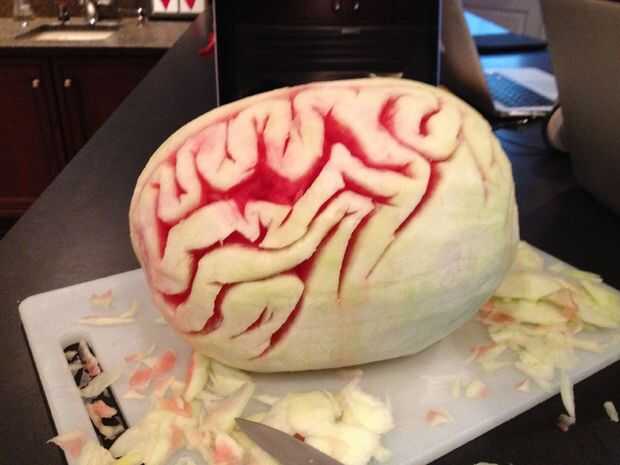 zombis de vegetariana incluso anhelan estos cerebros!Paso 1: fuentes de1 sandía sin semillas pequeñasPelador de verdurasCuchillo de cocinaCuchillo grandePaso 2: El melón de pielRebanada de la parte inferior de la sandía para que no ruede alrededor.Cá