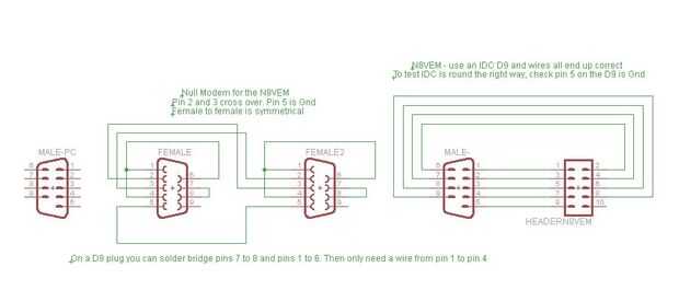 2) un módem nulo. Esto es una conexión hembra a hembra. Tengo el circuito de aquí http://www.beyondlogic.org/serial/serial.htm (Desplácese hacia abajo un poco). Básicamente, un módem nulo se une al pin 7 y 8, se une a pernos 1,4,6 e intercambia los pines 2 y 3 sobre. La conexión de 9 pines entonces se convierte en una conexión de 3 hilos-tierra, transmitir y recibir datos. Se simplifica de la RS232.