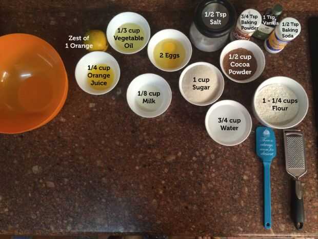 1-1/4 tazas de todo uso de la harina 1 taza de azúcar 1/2 cucharadita de sal 1/2 cucharadita de bicarbonato de sodio 3/4 de cucharadita de polvo para hornear 1/2 taza de cacao en polvo 3/4 de taza de agua 1/8 taza de leche 1/4 taza de naranja zumo de 1/3 de taza de aceite vegetal 2 huevos 1 cucharadita de ralladura de naranja Vainilla 1. Hervir el agua, agregar el cacao en polvo y revolver bien. 2. mezclar la leche y el zumo de naranja. 3. Mezcle todos los ingredientes secos juntos en un tazón. 4. Añadir el resto de los ingredientes (excepto el agua con el cacao en polvo) y remover hasta mezclar completamente. 5. Añadir el agua con el cacao en polvo y mezclar bien. 6. Hornear a 350 º c durante 30-40 minutos.