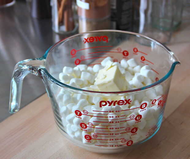 Las melcochas y tres cucharadas de mantequilla en un medio/gran tamaño del tazón de fuente y microondas un minuto a la vez, hasta agradable y fundidos juntos. Agitar después de cada vez en el microondas, preferentemente con una espátula de silicona - es más fácil de limpiar!