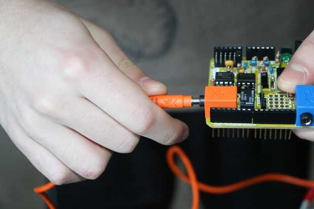 1) su electrodos pones en tu cuerpo están conectados a un cable de naranja. Este cable debe insertarse en un puerto naranja en el escudo del miógrafo.