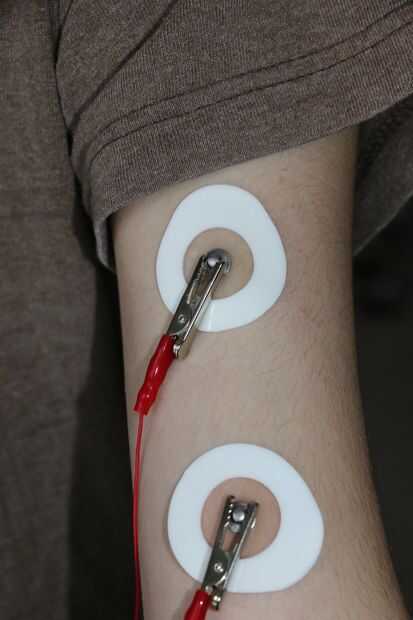 2) tome su electrodo a tierra (negro) y colóquelo en una parte de su cuerpo que no se flexiona. Esto actuará como una referencia a comparar con los resultados.