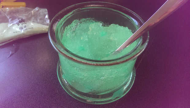 Espolvorear el polvo (bolsita 1) en el agua y remover, el agua de color y espese.