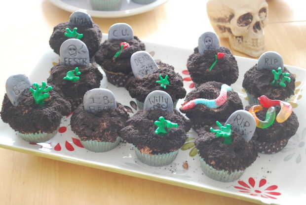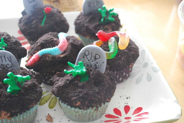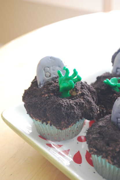 Los cupcakes de la lápida están cubiertos en hielo y espolvoreados con migas de Oreo. A escriba sobre las lápidas utiliza un marcador de alimento - Michael otra vez. Pero no funcionó tan bien, así que yo solo grabe con herramienta de fondant. Se asustó del fondant es como jugar con plastilina.
