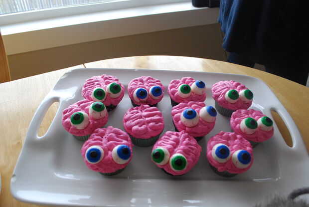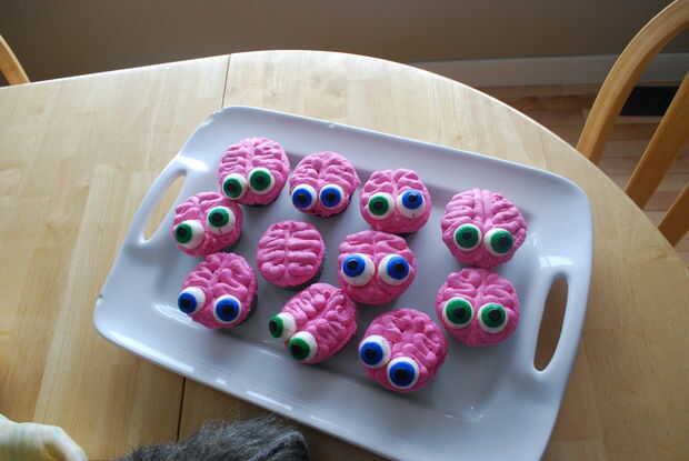 El truco para hacer que la formación de hielo parecen cerebros-go todo el cupcake para hacer un círculo. Luego realizar una línea de centro. Complete ambas mitades con squigglies zig-zag. Esto dio el efecto mejor"cerebro"
