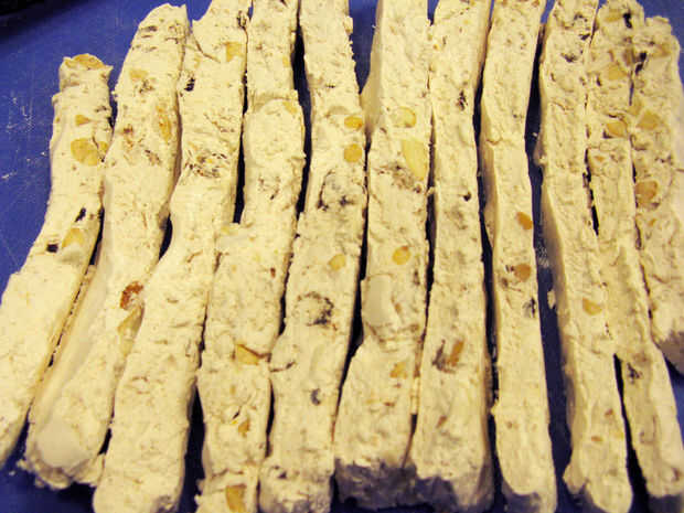 Utilicé un rodillo de pizza, espátula y cuchillo. Usar lo que tienes. Almidón de maíz y mantequilla le ayudará a evitar que se pegue. Corté en rebanadas largas, y por ahora nos estamos simplemente quitando trozos para comer como los paganos. Puedo acabar de cubierta en chocolate, pero es impresionante por sí mismo. Realmente es un caramelo de un único, descrito por uno de nuestros probadores de sabor "como comer una nube," que otros de acuerdo con. Realmente, hacer estas cosas, es bueno.