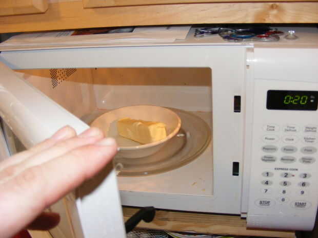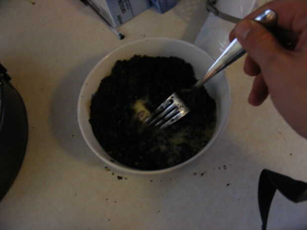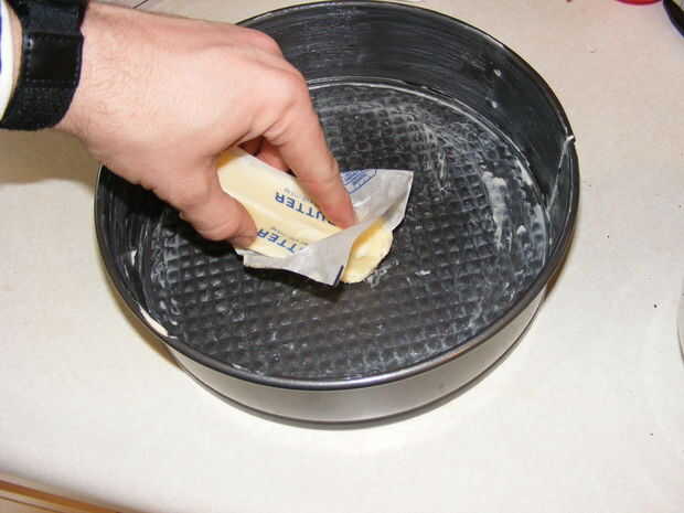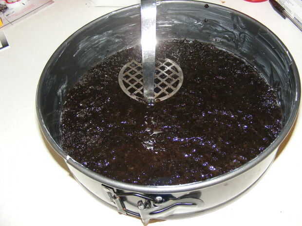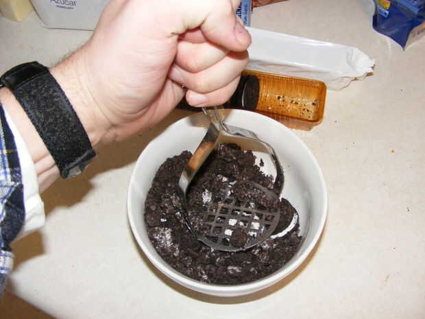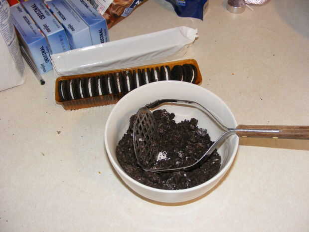 Ok, permite obtener la corteza comenzó. Primero abren su palillo de la mantequilla y engrasar el interior de la asadera. Estoy utilizando un molde de 9" para este pastel. Una vez que es agradable y con mantequilla, tomar la mantequilla restante y poner en un cuenco y meter en el microondas durante 1 minuto. Ahora abre su bolsa de Oreo y aplastar a los up realmente buena. Una vez que un plato de papilla de Oreo, añadir la mantequilla derretida del microondas y mezclar bien. NO comer esto es o no tiene ninguna corteza para tu tarta de queso! Ahora pueden volcar este mantecosa bondad de Oreo en su bandeja y presione uniformemente para hacer una deliciosa costra.
