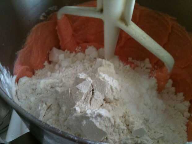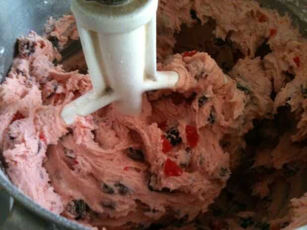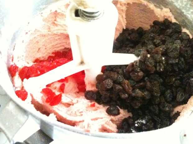 Añadir la harina cernida con soda y batir otra vez.  Mezclar las cerezas y pasas.
