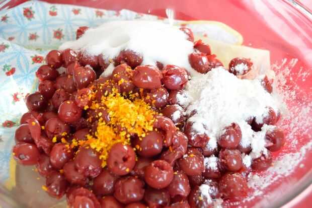 Combinar cerezas y los restantes cinco ingredientes en un tazón grande. Con una espátula de goma, mezclar suavemente hasta que las cerezas están recubiertas y mezcla se distribuye uniformemente.