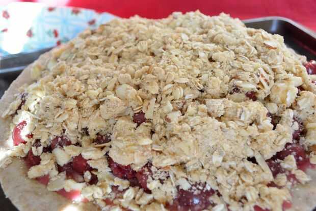 Vierta cerezas en la tarta y cubra uniformemente con crumble. Hornee hasta que piecrusts y centro de crumble dorado profundo y jugo de cerezas es burbujas buscar espesado, cerca de 1 ¼ a 1 1/2 horas. (Los jugos empieza a supurar de corteza y hoja forradas).
