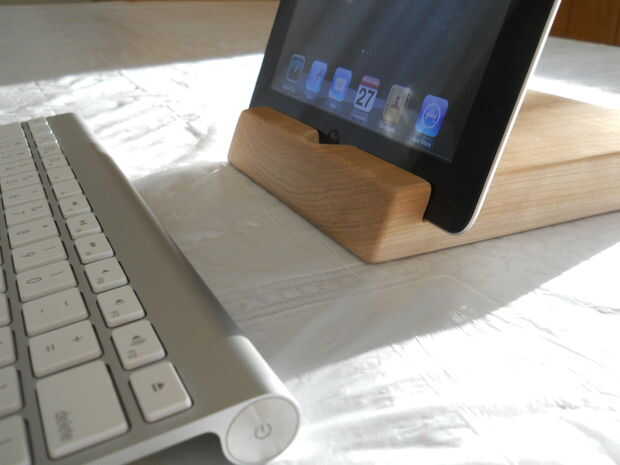 hice este soporte como un regalo de cumpleaños para mi madre. Ella lo ama y pensé que lo comparto con ustedes.  Se hace de arce y tamaño para caber el iPad en su estuche protector. Hay acceso a todos los puertos y botones en el iPad por lo que se pue
