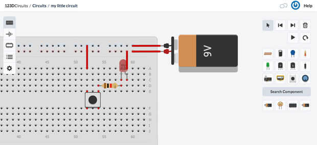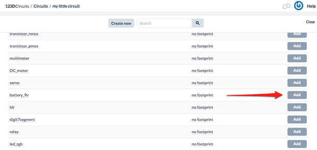 Ahora queremos añadir una fuente de alimentación. Haga clic en "Búsqueda de componente", desplácese hacia abajo un poco y añadir una batería de 9V. Conecte todo como se puede ver en la captura de pantalla.