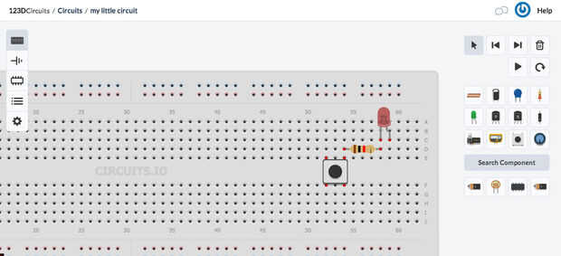 Agregar un LED, una resistencia y un botón de la caja de herramientas y colóquelo en la placa.