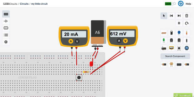 Puede Agregar multímetros para medir el voltaje y la corriente en el circuito. Ves allí es 20mA corriente por el circuito y hay 0.6 v sobre el LED. Si haces la resistencia muy pequeña, se verá que el LED explota porque usted está conduciendo con mucha corriente.