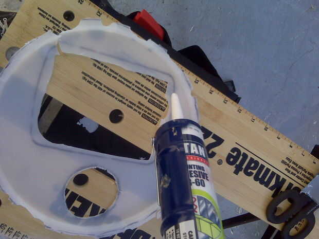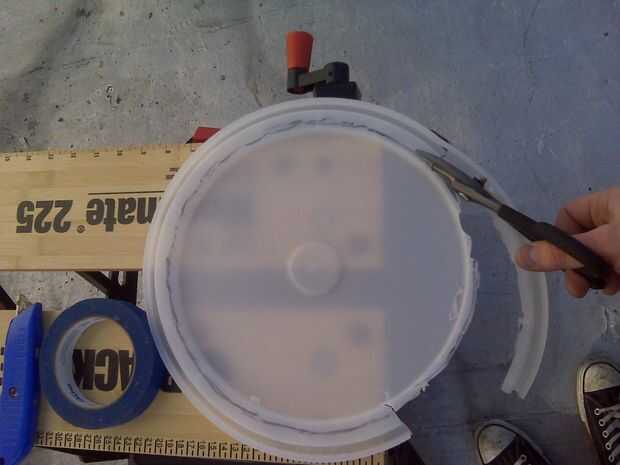 (nota de construcción: cuando corté las tapas de los cubos de 5 galones utilicé todos tijeras podadoras de propósito y descubrió que el material es ceroso y grietas fácilmente, por lo que cortar cuidadosamente, los cortes no tienen que ser exactas u ordenado y más grietas pueden ser fijo cuando lo monte, pero no desea que el material se agrieta completamente)