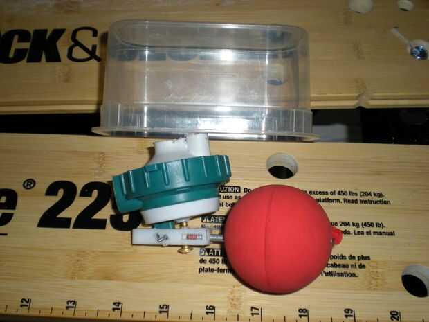 2. cortar el brazo del flotador para que todo quepa en el recipiente de tupperware.