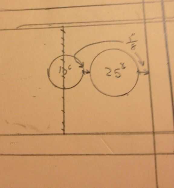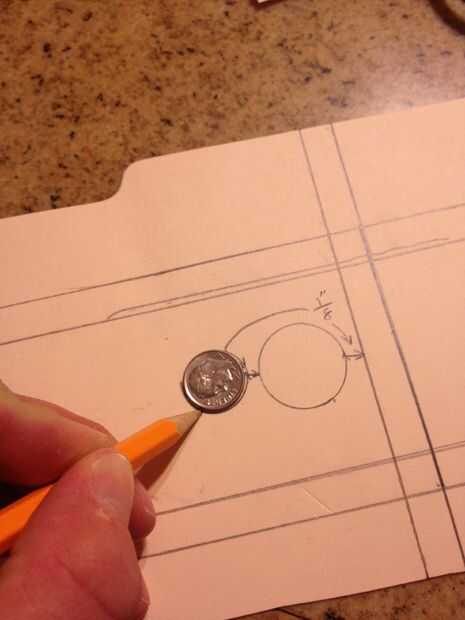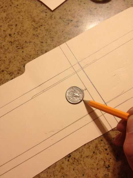 Paso 10: Coloque un cuarto centrado entre las dos líneas originales de "canción del tren" y 1/8 inch-ish de la línea nueva "pista del tren". Dibuja alrededor del cuarto. Escriba "cortar" en el centro del círculo. Paso 11: colocar una moneda de diez centavos centrado entre las dos líneas originales de la "vía de tren" y 1/8 inch-ish del casco. Traza en torno a la moneda de diez centavos. Paso 12: Trace una línea por el centro de la moneda de diez centavos y a través de la cartulina. Parada de la línea en cada "pista". Dibujar las marcas de hash para indicar que se trata de una "línea de corte"