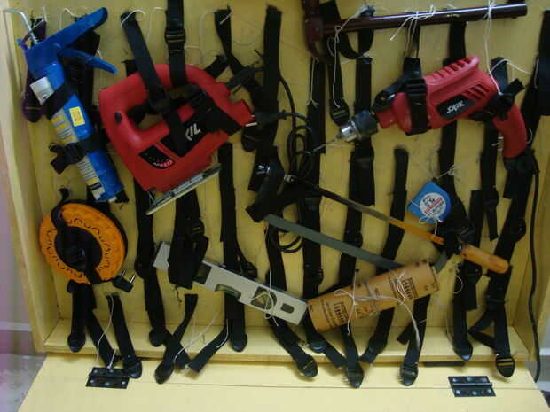 Las herramientas se llevan a cabo firmemente por el nylon, por lo que es favorable al viaje (velocidad no hará nada). Utilice hilos de rosca (para más herramientas como destornilladores martillos pequeños) o correas (para la maquinaria como sierras, taladros).