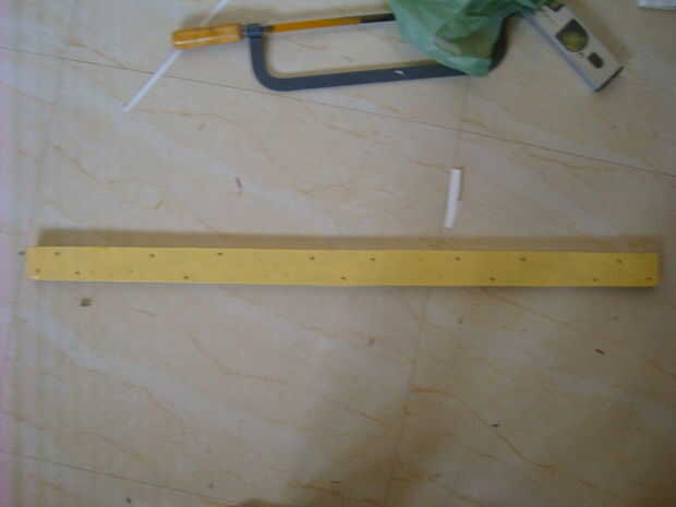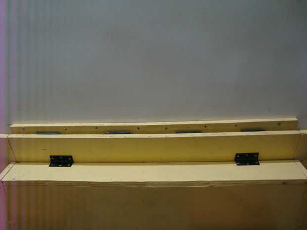 Uso 2 pulgadas por 3 pies la tira que cortamos y marque los orificios de las cuatro bisagras en el borde superior de la estación de trabajo principal.