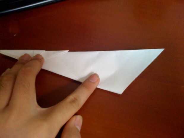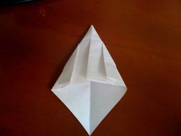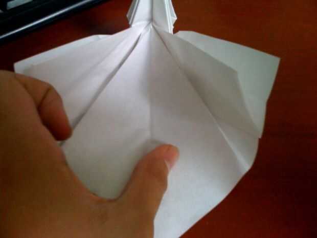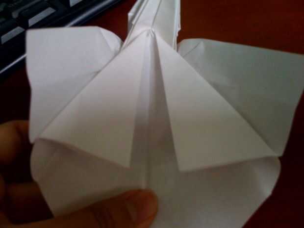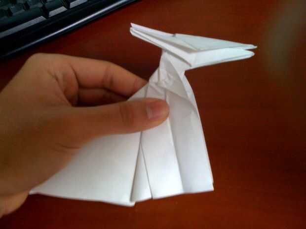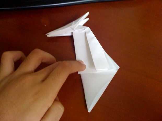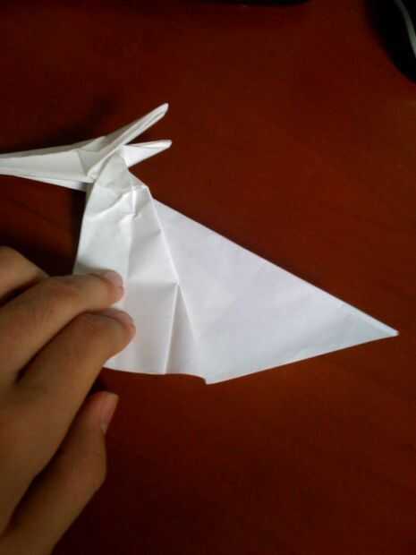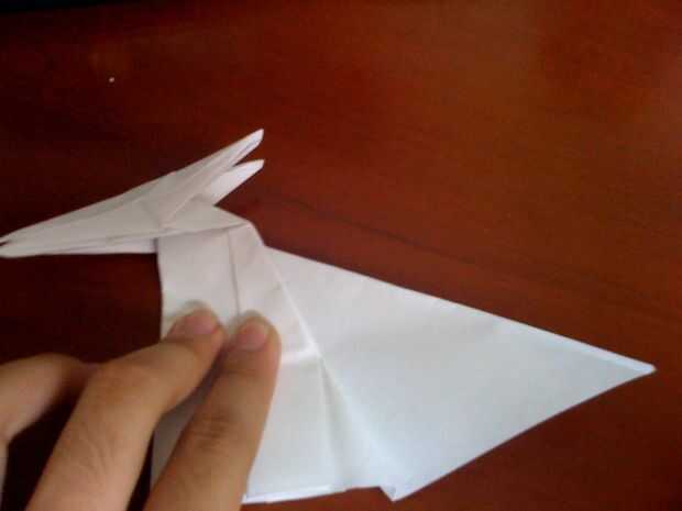 Turn over the model. El modelo de cometa-fold. Luego Valle doblar el modelo. Reverse-Fold el cuerpo hacia abajo. El reverso doble otra vez. (Es como hacer un pliegue doble). Doblez de Valle la capa delantera. Abrir el cuerpo. Cometa-plegar la capa. Cerca del cuerpo.