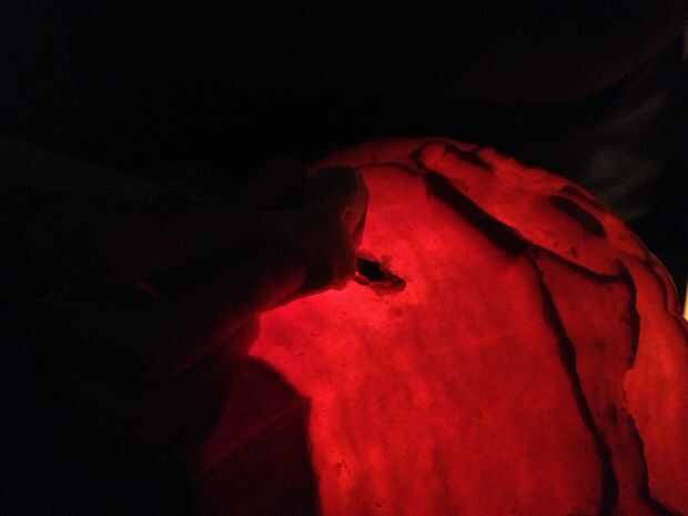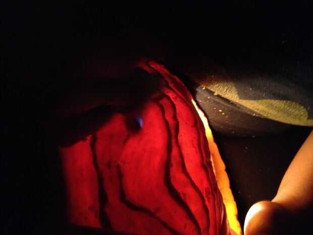 Apagar las luces de todas las luces (trabajo en la oscuridad) y una batería había operado LED linterna o luz dentro de la calabaza.