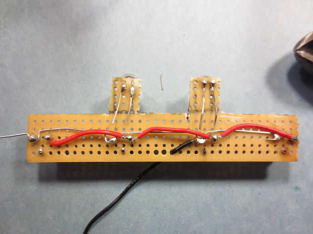 Para conectar todos los potenciómetros; comenzar por hacer un puente como se muestra en el cuadro 7. No tienes que hacer esto, se podría usar un alambre aislado como yo lo hice con los aspectos positivos. Conectan todos los negativos (lado izquierdo). Conectan todos los positivos (lado derecho).