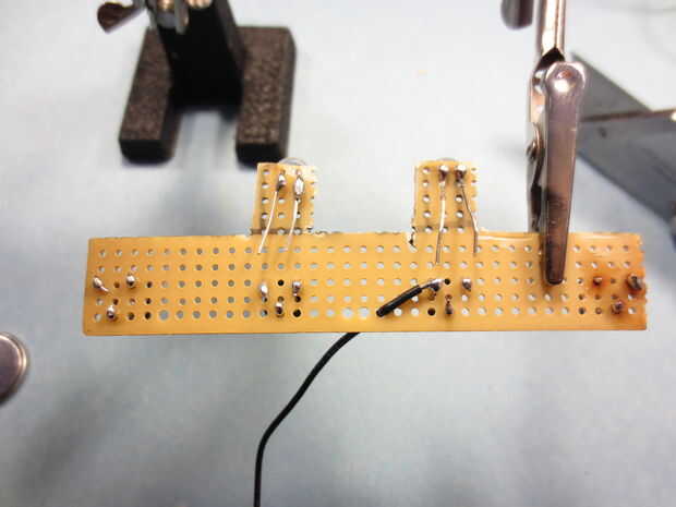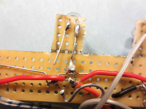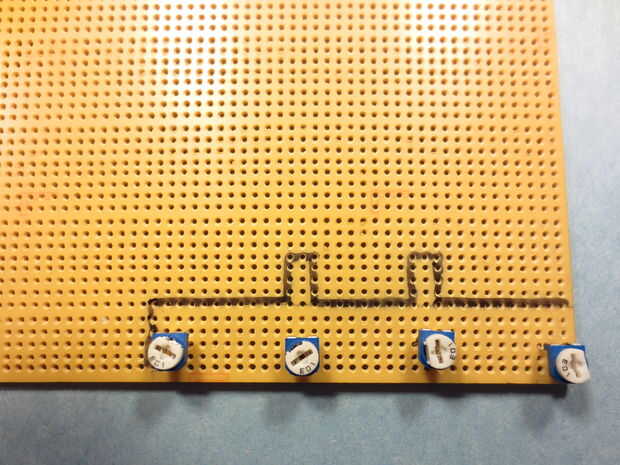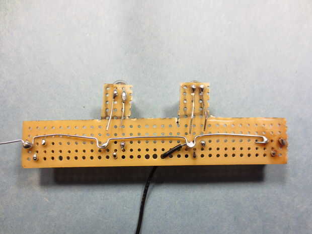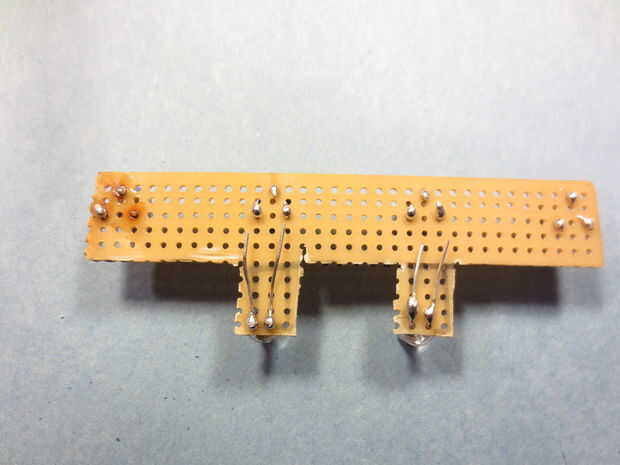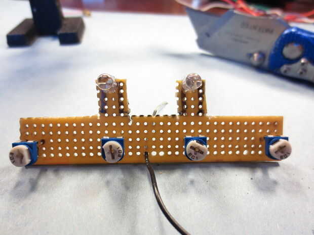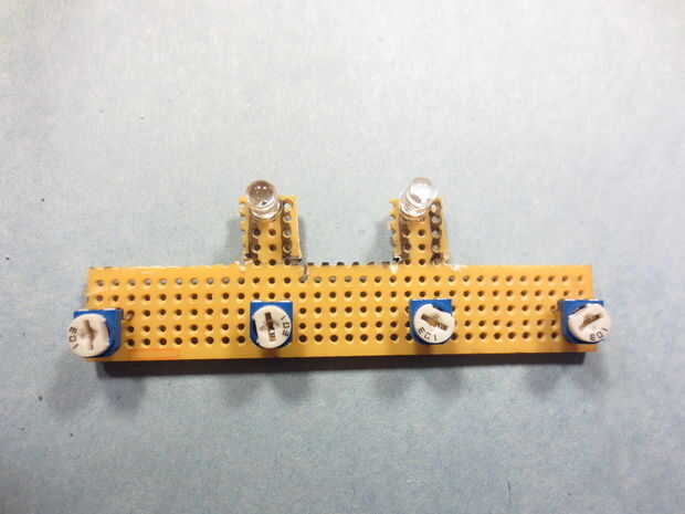 de todos modos estamos va a conseguir comenzado mi dibujo una pequeña plantilla para 2 LEDs (o una si tiene LED RGB) y para las macetas. Espaciadas las macetas cerca de 1 1/2 pulgadas aparte. Sólo tener en cuenta que tienes que dejar espacio suficiente para su girando la perilla. Recorte su plantilla y todos los componentes para la soldadura.