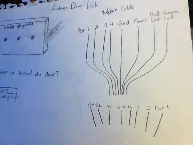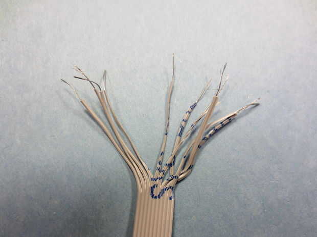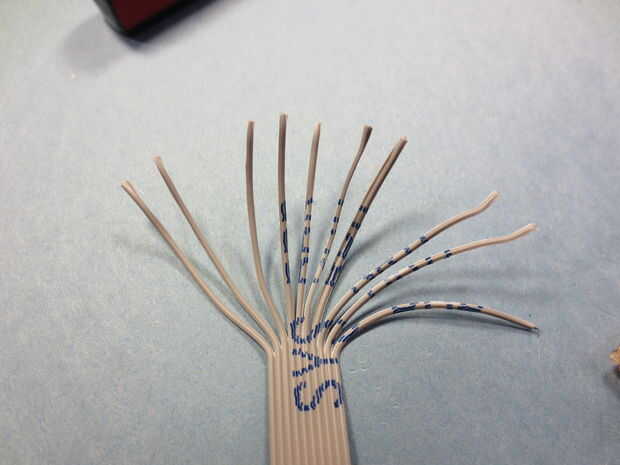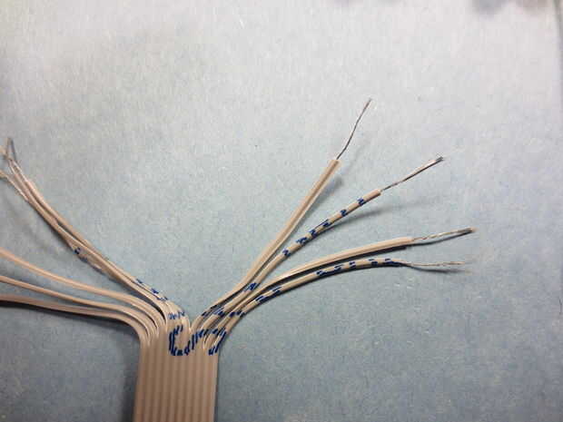 Trabajar con cables de cinta puede ser complicado, pero encontré una manera de dominarlo. Dibujar un diagrama! Se puede ver en mi diagrama (la tapa) donde todo debe ir. El fondo está todo invertido porque cuando estaba de soldadura estaba soldando con ella boca abajo.
