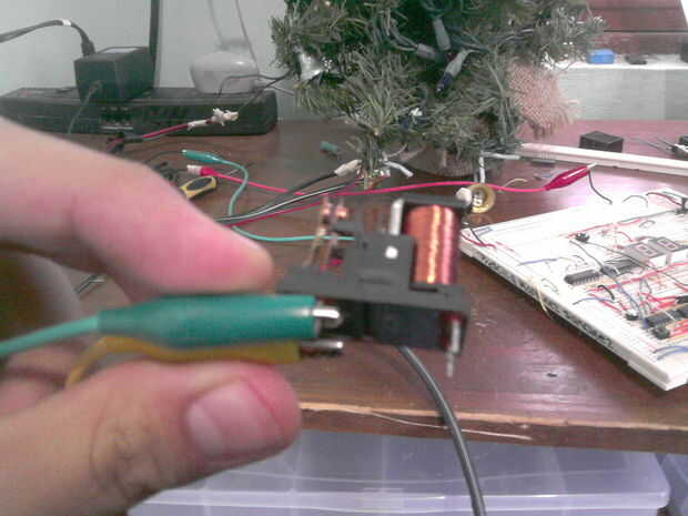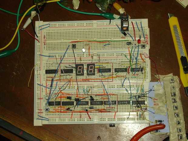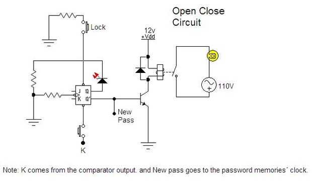 Finalmente la última parte, ya casi terminamos! Pronto enogh usted podrá bloquear cualquier dispositivo o electrificar cualquier cerca, (no por favor!) Ahora, tomamos el último bit de información y la interrupción con un push button, así que si alguien accidentalmente escribe la contraseña correcta, la cerradura wont open. (llamé a este botón "enter", realmente inteligente, EH!,) Y después la tecla enter, se viene el RS cierre, un dispositivo que puede Q´ a 1 si un there´s un 0 en el su R de entrada y guardar y Q en 1 si hay un 0 en la S de entrada. Para más información sobre RS pestillo: http://en.wikipedia.org/wiki/D_flip_flop#SR_flip-flops conecté "Q" con una luz roja led cerradura de significado, o que el dispositivo de control está apagado. Y "Q´" a un transistor que proporcionará el relé enogh actual para activar, encender el dispositivo controlado. "Q´" fue conectado a un pulsador, (que llamé nuevo botón contraseña por razones obious) para que al pulsar que abrocharlo que se cerrará el circuito entre Q´ y el reloj de entrada para la memoria de la contraseña. Si Q´ es baja (sistema cerrado) nada va a cambiar en la memoria de contraseña cuando se presiona el botón, se activará, pero si es el reloj de alta (sistema abierto) y memorias de contraseña copiará la información en la memoria de pantalla. (cambiar la contraseña). Y conectado una resistencia de GND y un pulsador (botón de bloqueo) y de allí a la S de la entrada, así que cuando lo pulsa, se bloqueará el sistema. Bueno, mientras que yo pude haber comprado un flip RS flop sólo para este propósito, todavía tengo un ff JK a la izquierda de mi 7476. Y causar las entradas R y S son asincronous, no tiene que preocuparse sobre el reloj. Conectar tan sólo las cosas tal como se muestra en el diagrama (como lo hice.) Tenga cuidado al conectar el relé a la CA, utilice suficiente cinta aislante... No quiero un corto circuito cuando se trabaja con cientos de voltios! Después de conectar todo junto... finalmente terminamos!!! No dude en comentar cualquier pregunta o sugieren, si observa cualquier problema o error no dude en ponting hacia fuera. Estoy aquí para ayudar. Cerradura de la buena, o sea, buena suerte con eso cerradura.