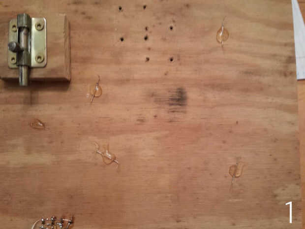 La cerradura de la puerta deslizante del asiento (no olvidar un pequeño agujero para la espiga se deslice en) y utilizar pegamento caliente para fijar los interruptores cuatro reed en el interior tapa de su caja. No pongo los interruptores cerca uno del otro o su imán inadvertidamente puede accionar el interruptor equivocado. También Perfore cuatro agujeros para el indicador LED (Foto 1).
