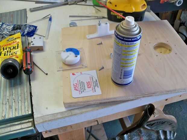 Cortar un disco de plástico fino de envases de desecho, o en mi caso un calendario basura que cabe en la parte inferior del agujero para el vaso. Esto reduce la fricción en el vaso. Una lata de WD-40 pasó a ser del tamaño correcto para el disco, así utilicé como un rastro de templateto un círculo y cortar con un par de tijeras. Coloque el círculo de plástico en la parte inferior del agujero. Con el vaso completamente montado, colóquelo lateral ranura abajo (la ranura en el vaso que el perno se deslice para permitir que la puerta se abra cuando desbloqueado).